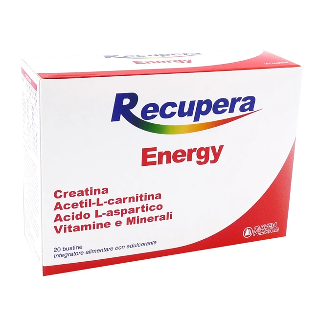 RECUPERA ENERGY è un integratore alimentare a base di Creatina, Acetil-L-carnitina, Acido L-aspartico, Vitamine e Sali minerali. L’assunzione giornaliera di 3 g di creatina incrementa le prestazioni fisiche in caso di attività ripetitive, di elevata intensità e di breve durata. Il Magnesio contribuisce alla normale funzione muscolare. Vitamina C, Vitamina B5 e Magnesio contribuiscono alla riduzione della stanchezza e dell’affaticamento ed al normale metabolismo energetico. Zinco e Magnesio contribuiscono alla normale sintesi proteica.