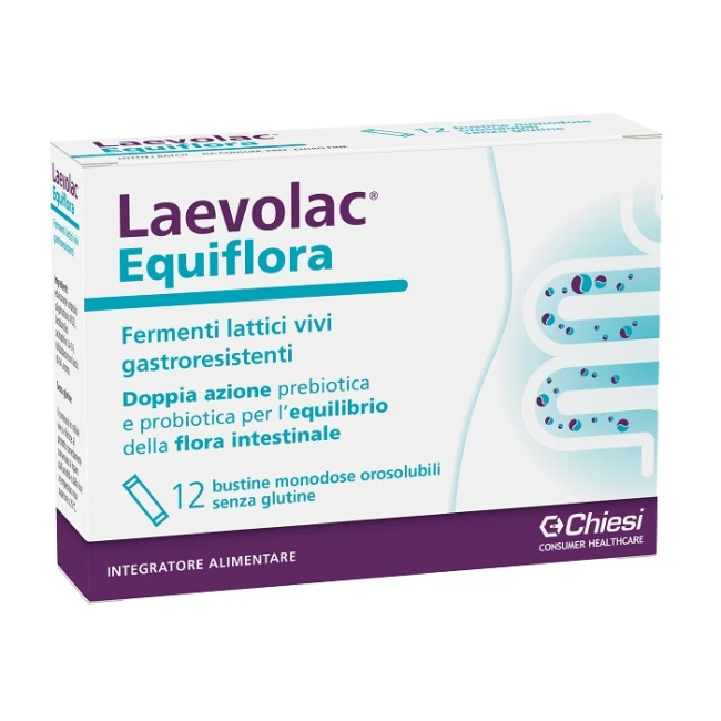 Laevolac Equiflora bustine monodose orosolubili svolge una doppia azione in quanto costituito dall’associazione di fermenti lattici probiotici con il nutriente prebiotico: