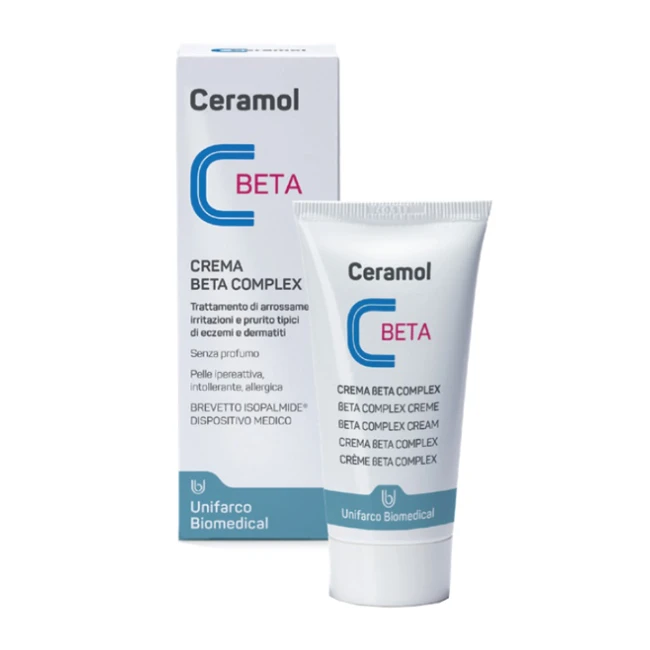 Ceramol Beta-Complex è una crema emolliente formulata come dispositivo medico per il trattamento di eczemi, dermatiti e irritazioni cutanee che grazie alla sua composizione ricca di lipidi epidermici e agenti lenitivi, aiuta a ripristinare la barriera cutanea, contrastando prurito, rossori e secchezza.