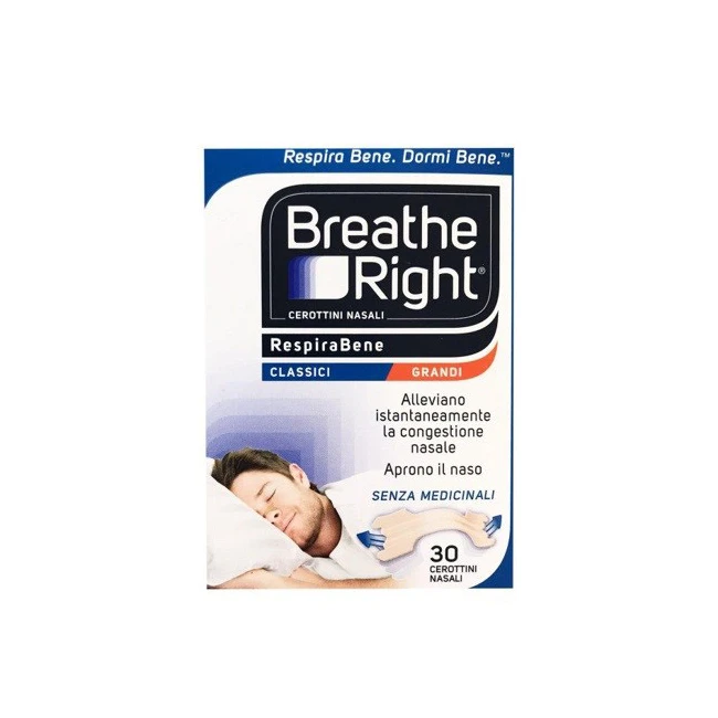 Breath Right RespiraBene è un dispositivo medico per adulti che aiuta a respirare meglio e a ridurre il russamento; i cerottini nasali Breath Right Respirabene allargano delicatamente i passaggi nasali, facilitando la respirazione in caso di congestione nasale, allergia o raffreddore.
