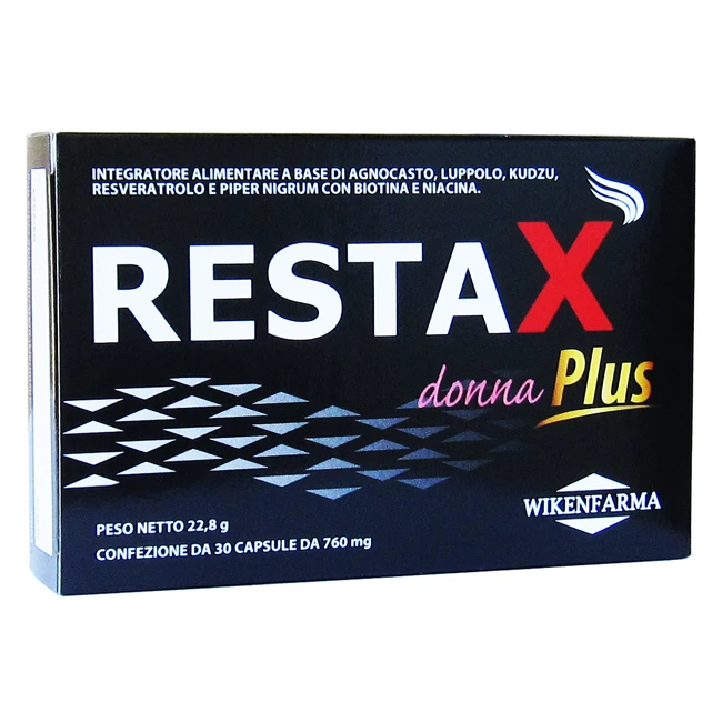 Restax donna plus è un integratore alimentare a base di agnocasto, luppolo, kudzu, resveratrolo e Piper nigrum con biotina e niacina. La biotina contribuisce al mantenimento di capelli normali, la niacina contribuisce al normale metabolismo energetico.