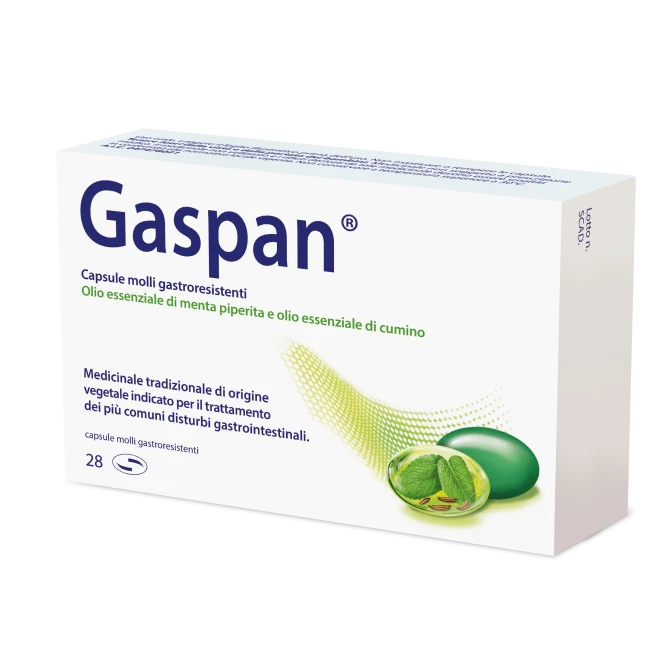 Gaspan è un medicinale tradizionale di origine vegetale formulato con olio essenziale di menta piperita (90 mg) e olio essenziale di cumino (50 mg) per capsula, indicato per il trattamento dei disturbi gastrointestinali lievi, usato per alleviare crampi addominali, flatulenza, sensazione di pienezza e dolore addominale, anche nei pazienti con dispepsia o sindrome del colon irritabile (IBS).