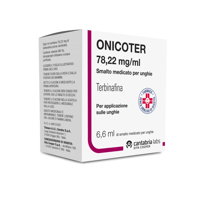 Onicoter 78,22 mg/ml è uno smalto medicato per il trattamento delle infezioni fungine delle unghie (onicomicosi) da lievi a moderate negli adulti la cui efficacia si basa sulla terbinafina, un antifungino ad ampio spettro che inibisce la sintesi dell’ergosterolo della parete fungina, contribuendo alla progressiva eliminazione del patogeno e favorendo la ricrescita di un’unghia sana.