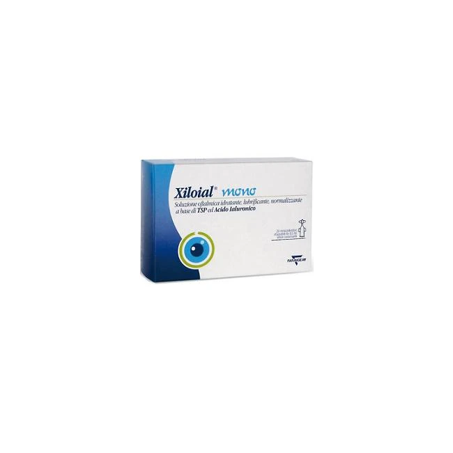 Dispositivo medico CE. Soluzione oftalmica idratante, lubrificante, contenente sostanze lubrificanti e protettive: Acido ialuronico, mucomimetico, lubrificante, Ts-Polisaccaride, protettivo equilibrante. Xiloial mono è una soluzione oftalmica a base di Ts-Polisaccaride (TSP), contenente acido ialuronico ad alto peso molecolare, ottenuto per sintesi biotecnologica. L’Acido ialuronico è una sostanza che dà origine a soluzioni mucomimetiche, con elevate proprietà lubrificanti; la viscosità di tali soluzioni è tale da consentire un effetto idratante ed una stabilizzazione del film lacrimale. Il Ts-Polisaccaride è una sostanza vegetale, estratta dai semi della pianta del tamarindo (Tamarindus Indica), utile per la protezione della superficie corneo-congiuntivale. Il Ts-Polisaccaride forma sulla superficie oculare un film protettivo in grado di favorire il ripristino del normale equilibrio fisiologico del film lacrimale e della superficie oculare. La combinazione delle due sostanze, permette dunque un’attività sinergica di protezione della superficie corneo/congiuntivale, dalle irritazioni dovute a cause fisiche ambientali (vento, esposizione prolungata ai raggi solari, fumo di sigaretta, aria secca), a stress visivo (intenso impegno della vista, videoterminali) o a fattori meccanici (lenti a contatto, interventi di chirurgia oculare).Modalità d'utilizzo