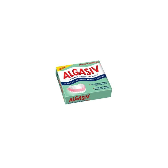 CUSCINETTI PER DENTIERA SUPERIORECuscinetto morbido con due potenti adesivi naturali che blocca la dentiera tutto il giorno, protegge le gengive da fastidiose irritazioni e combatte i cattivi odori della bocca. Algasiv per dentiera superiore è un morbido cuscinetto, con due potenti adesivi naturali, che blocca la dentiera tutto il giorno, protegge le gengive da fastidiose irritazioni e combatte i cattivi odori della bocca.