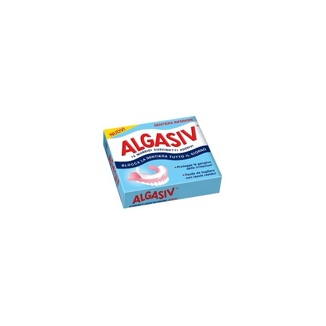 CUSCINETTI PER DENTIERA INFERIORECuscinetto morbido con due potenti adesivi naturali che blocca la dentiera tutto il giorno, protegge le gengive da fastidiose irritazioni e combatte i cattivi odori della bocca. Algasiv per dentiera inferiore è un morbido cuscinetto, con due potenti adesivi naturali, che blocca la dentiera tutto il giorno, protegge le gengive da fastidiose irritazioni e combatte i cattivi odori della bocca.