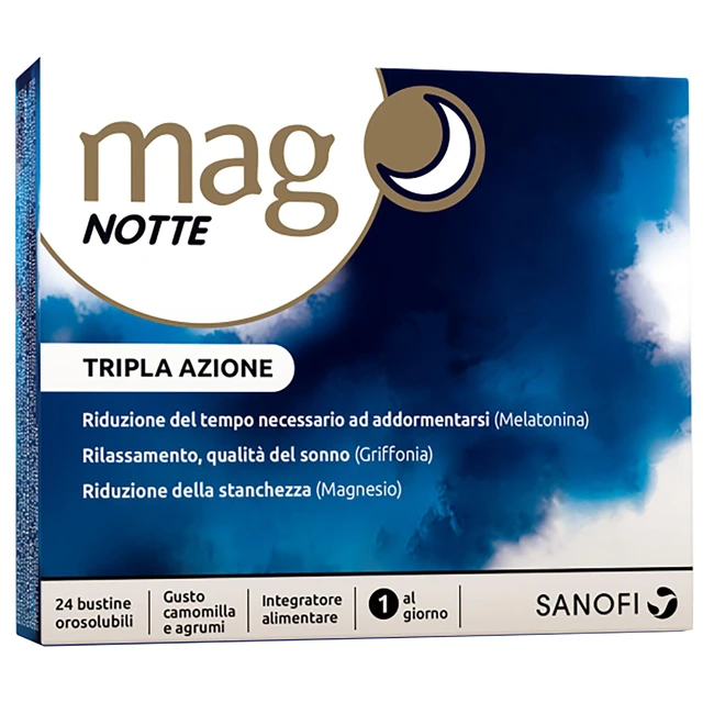 Integratore alimentare a base di magnesio, melatonina, griffonia e triptofano, con edulcoranti, indicato quando si ha difficoltà ad addormentarsi e per contribuire alla qualità del sonno.