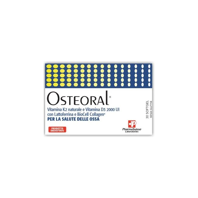 Osteoral è un complemento alimentare a base di Vitamina K2 naturale, Vitamina D3 (2000 UI), Lattoferrina e BioCell Collagen, collagene idrolizzato a contenuto standardizzato di Acido ialuronico e Condroitin solfato, utile in caso di aumentato fabbisogno o ridotto apporto con la dieta di tali nutrienti. Le Vitamine K2 e D3 aiutano a mantenere la salute delle ossa.