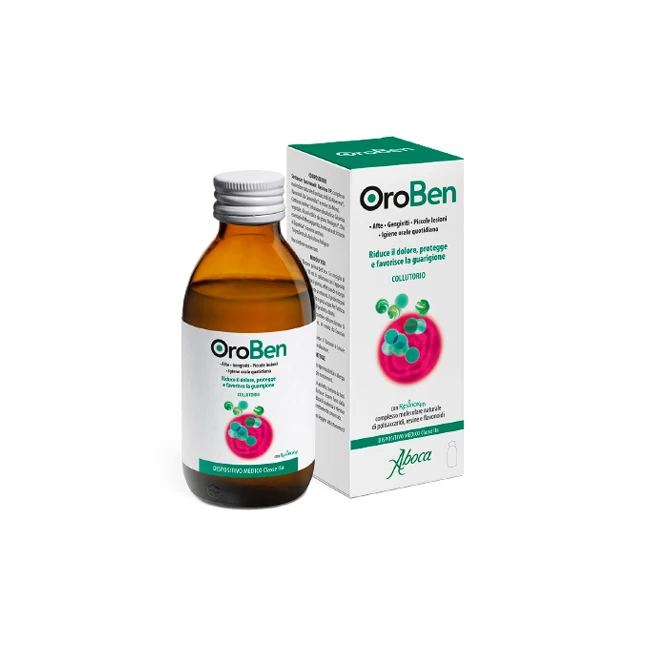 -Antiossidante: protegge la mucosa dall'azione irritante dei radicali liberi. Grazie a questi meccanismi, il prodotto svolge un'azione antinfiammatoria indiretta e favorisce la riparazione tissutale riducendo i tempi di guarigione. Inoltre l'olio essenziale di menta, esplica un'azione rinfrescante lasciando in bocca una piacevole sensazione di freschezza, utile anche a ridurre l'alitosi che spesso accompagna le gengiviti. OroBen Collutorio permette di raggiungere ogni parte del cavo orale, mediante sciacqui e gargarismi, consente la rimozione di agenti irritanti e favorisce quindi il controllo del microambiente, l'igiene e la protezione della bocca. Non contiene conservanti.