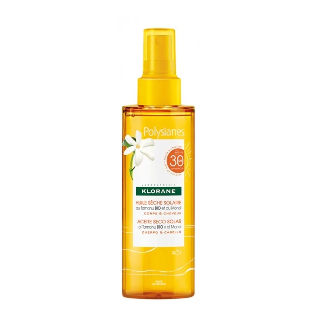 Olio secco solare al Tamanu Bio e al Monoï. Non grassa, sensuale e satinata, la sua formula regala luce e splendore proteggendo dai raggi UVA e UVB. Abbronzata, satinata, profumata alle note di Fiori di Tiaré, la pelle è nutrita e sublimata.
