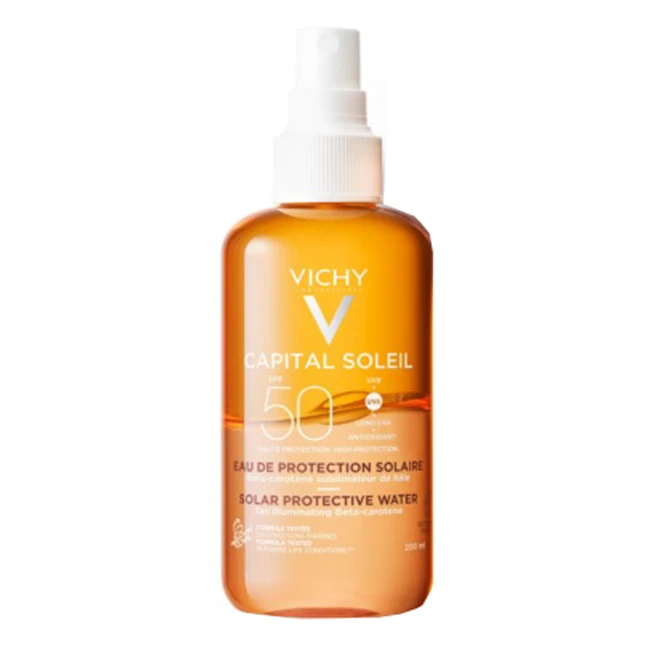 Vichy Capital Soleil Acqua Solare SPF50 è un’acqua solare protettiva che unisce una protezione solare molto alta con un’azione illuminante e uniformante del colorito grazie alla presenza di beta-carotene.