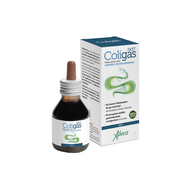 Integratore alimentare utile in caso di gonfiore addominale spesso associato a fastidiose tensioni che possono essere avvertite subito dopo i pasti o durante la giornata. L'esclusiva formulazione si contraddistingue per la sinergia tra gli estratti di coriandolo e zenzero che, uniti a cumino e finocchio, sono utili per favorire l'eliminazione dei gas intestinali. Zenzero e cumino inoltre, supportano la regolare motilità gastrointestinale e coadiuvano la digestione. ColiGas Fast è un integratore alimentare naturale e biodegradabile al 100%, non contiene sostanze di sintesi, emi- sintesi o geneticamente modificate.