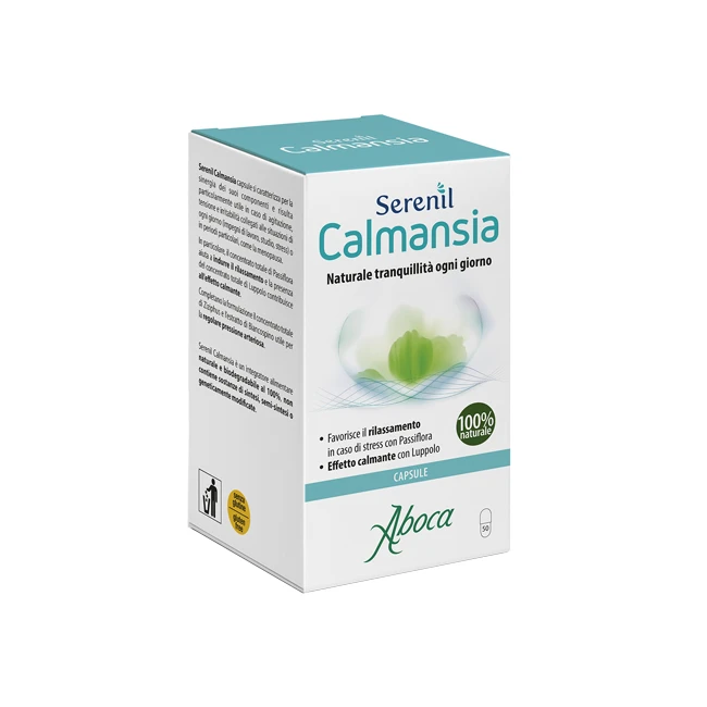 Integratore alimentare naturale e biodegradabile al 100%, utile in caso di agitazione, tensione e irritabilità collegati alle situazioni di ogni giorno (impegni di lavoro, studio, stress) o in periodi particolari, come la menopausa. In particolare, il concentrato totale di Passiflora aiuta a indurre il rilassamento e la presenza del concentrato totale di Luppolo contribuisce all'effetto calmante. Completano la formulazione il concentrato totale di Ziziphus e l'estratto di biancospino utile per la regolare pressione arteriosa. Serenil Calmansia non contiene sostanze di sintesi, semi-sintesi o geneticamente modificate.