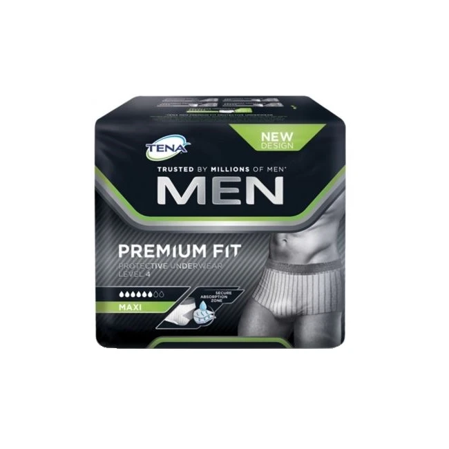 - design maschile: TENA Men Premium Fit è specificamente studiato per gli uomini, la mutandina ha un taglio tipo boxer a vita bassa, che permette di indossarlo con qualsiasi tipo di abbigliamento. Il girogamba è opportunamente disegnato per garantire protezione e sicurezza in uso. Il rivestimento esterno è coprente come tessuto, quindi discreto, la fascia al girovita grigia ed il disegno a righe della mutandina lo rendono simile alla normale biancheria intima maschile;