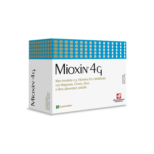 Integratore alimentare a base di Myo-inositolo, vitamina D3, metilfolato, magnesio, zinco e cromo, con fibra alimentare solubile, utile in caso di ridotto apporto con la dieta o aumentato fabbisogno di tali nutrienti. Il magnesio contribuisce al normale metabolismo energetico e alla normale funzione muscolare. Lo zinco contribuisce al normale metabolismo dei carboidrati. Il cromo contribuisce al normale metabolismo dei macronutrienti e al mantenimento di livelli normali di glucosio nel sangue. La vitamina D e l'acido folico intervengono nel processo di divisione delle cellule. L'assunzione integrativa di Acido folico aumenta lo stato del folato materno. Un basso stato del folato materno è un fattore di rischio per lo sviluppo di difetti del tubo neurale nel feto. Mioxin 4G contiene Quatrefolic, Acido folico in forma biologicamente attiva (Metilfolato).