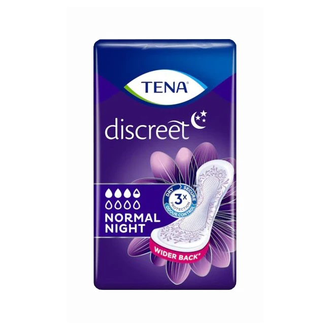 Assorbente per perdite urinarie. Studiato per incontinenza da leggera a moderata. Tena Discreet Normal Night è appositamente studiato per offrirti un’elevata protezione quando sei in posizione distesa, infatti questo assorbente ha la parte posteriore più larga e ti offre un'elevata protezione nelle ore notturne in caso di perdite urinarie da leggere a moderate. Questo prodotto ti offre un’elevata assorbenza dove ne hai più bisogno, intrappolando velocemente il liquido lontano dalla pelle, mantenendoti così asciutta, mentre le micro-perle attive riducono la formazione di cattivi odori. Grazie agli elastici laterali, rimane nella corretta posizione e si adatta alle forme del corpo per un elevato comfort: così potrai godere di un riposo notturno sereno e risvegliarti fresca e asciutta. Lunghezza: 34 cm.