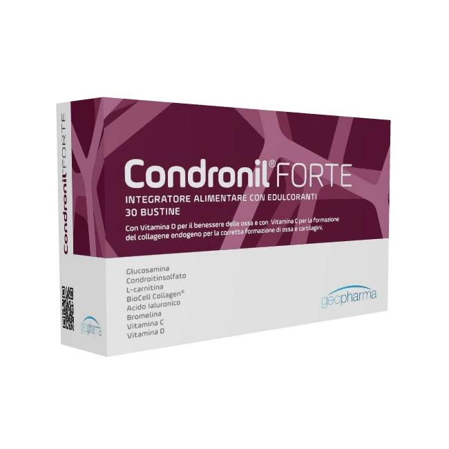 Condronil Forte è un integratore alimentare a base di Glucosamina solfato, L-Carnitina, BioCell Collagen, Acido Ialuronico, Vitamina C, Bromelina e Vitamina D.