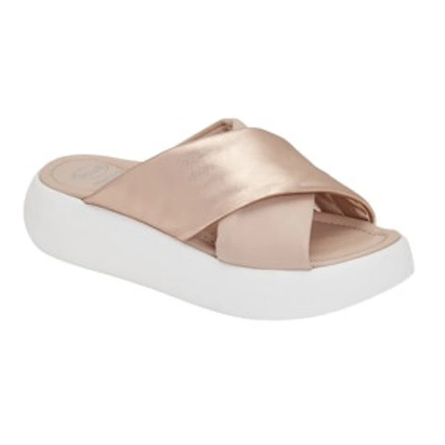 Sandalo con tomaia cross. Plantare con tecnologia Scholl Memory Cushion che si adatta all'anatomia del piede ed aiuta a ridistribuire la pressione esercitata su tutta la pianta donando una sensazione di leggerezza.