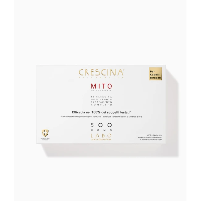 Crescina Ri-Crescita Neo Mito 500 comprende due tipologie di fiale: una per la ri-crescita e una per il contrasto alla caduta, permettendo un trattamento completo. Ogni confezione da 20+20 fiale offre una riserva per due mesi di terapia efficace.Adatto per