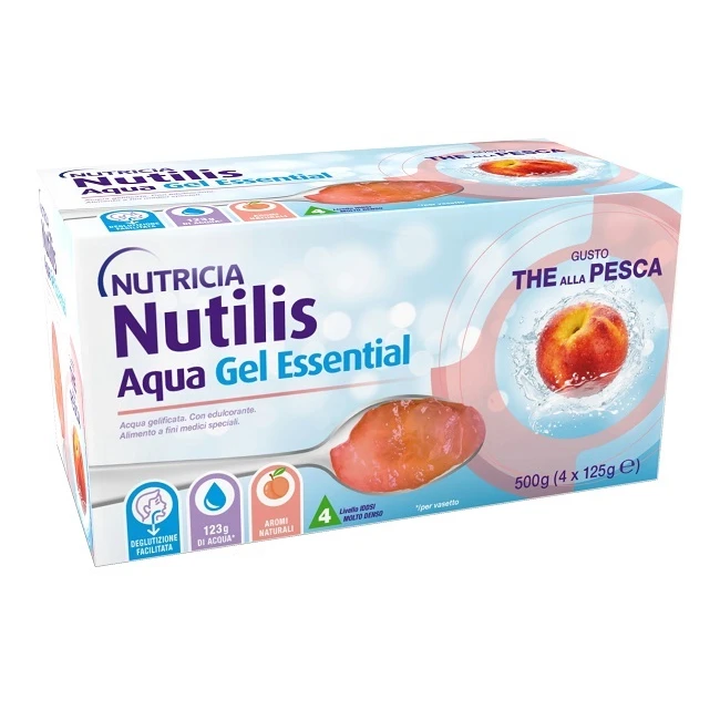Alimento a fini medici speciali. Contiene edulcorante. Indicato per la gestione dietetica della malnutrizione associata a patologia in caso di disfagia. Nutilis Aqua Gel Essential è un alimento a fini medici speciali ad elevato contenuto di acqua (98%) la cui consistenza è stata modi cata con l'aggiunta di speci ci addensanti per renderlo idoneo all'idratazione di pazienti con problemi di deglutizione (disfagia).