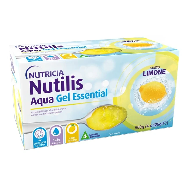 Alimento a fini medici speciali. Contiene edulcorante. Indicato per la gestione dietetica della malnutrizione associata a patologia in caso di disfagia. Nutilis Aqua Gel Essential è un alimento a fini medici speciali ad elevato contenuto di acqua (98%) la cui consistenza è stata modi cata con l'aggiunta di speci ci addensanti per renderlo idoneo all'idratazione di pazienti con problemi di deglutizione (disfagia).