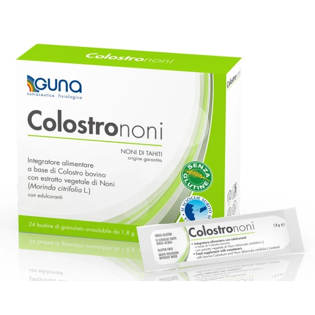 Edulcorante: sorbitolo; colostro bovino liofilizzato (contiene derivati del latte), noni (Morinda citrifolia L., frutto) succo in polvere, maltodestrine, aroma; agente antiagglomerante: biossido di silicio; edulcorante: sucralosio.