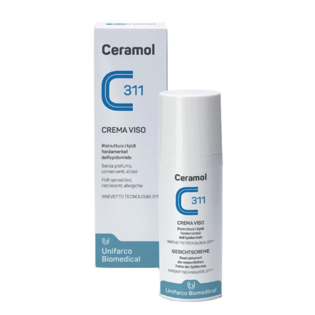 Ceramol 311 Crema Viso è un trattamento quotidiano ad azione emolliente e nutriente, ideale per pelli secche, molto secche, sensibili, intolleranti o allergiche che grazie alla sua formula ricca di ceramidi, colesterolo e acidi grassi, ristruttura la barriera cutanea e riduce secchezza e fastidi.