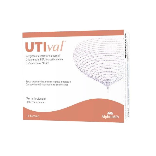 Integratore alimentare a base di D-Mannosio, Palmitoiletanolamide, N-acetilcisteina, Lactobacillus rhamnosus (LR04) microincapsulato e HiBCYN. UTIval è indicato in tutti i casi di insufficiente apporto nella dieta o aumentato fabbisogno di tali nutrienti. Il Lactobacillus rhamnosus favorisce l’equilibrio della flora intestinale. L’estratto di ibisco (HiBCYN) favorisce la funzionalità delle vie urinarie.