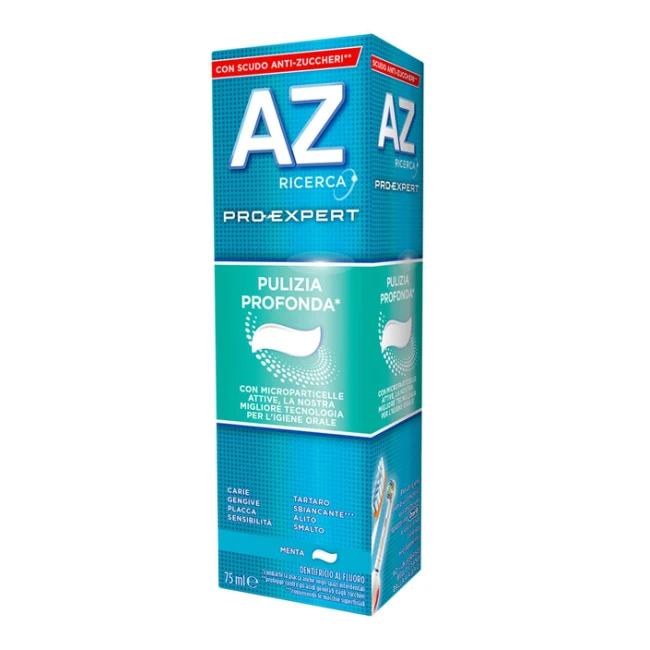 Il dentifricio AZ Pro-Expert Pulizia Profonda utilizza microparticelle attive solubili in quantità 5 volte superiore rispetto al normale dentifricio AZ Pro-Expert per intervenire in profondità donando una incredibile sensazione di pulito. Contiene il complesso di Floruro Stannoso Stabilizzato, un'esclusiva combinazione di agenti attivi che contrasta i problemi del cavo orale, proteggendolo da carie, placca, disturbi gengivali, sensibilità, macchie, alito cattivo, tartaro ed erosione dello smalto.