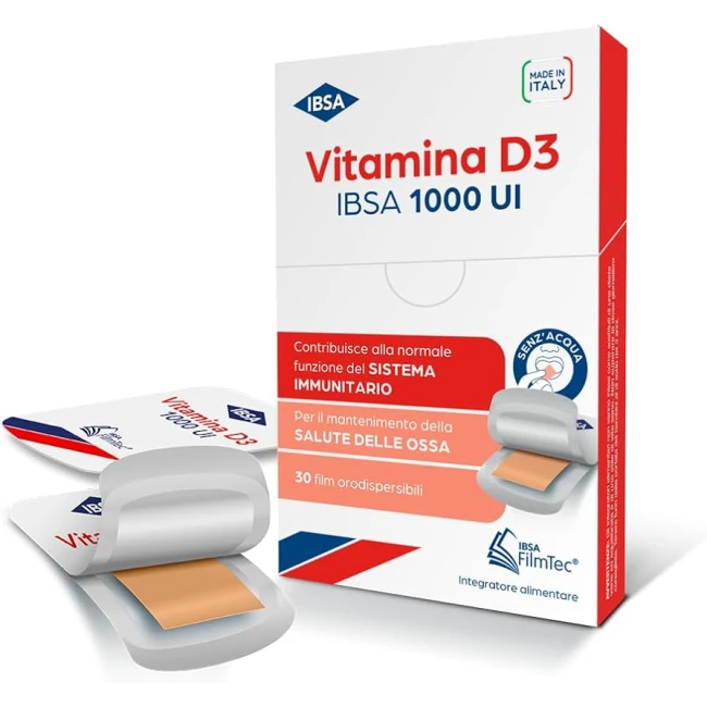 Ibsa Vitamina D3 1000 è un integratore alimentare a base di vitamina D3 (colecalciferolo), utile per sostenere la salute di ossa, denti e sistema immunitario. La sua formulazione in film orali orodispersibili garantisce un’assunzione pratica, senza bisogno d’acqua, e un assorbimento rapido ed efficace. Ideale per chi necessita di un supporto quotidiano al benessere generale e alla funzionalità muscolare.