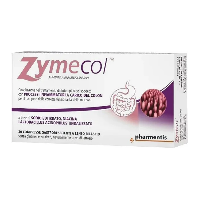 Zymecol è un alimento medico a fini speciali, indicato per trattamento dietetico di soggetti con processi infiammatori a carico del colon per il recupero della corretta funzionalità della mucosa, a base di sodio butirrato, niacina e Lactobacillus acidophilus tindalizzato. Le compresse hanno un rivestimento gastroresistente, che protegge gli attivi dagli acidi dello stomaco e ne consente il rilascio nella parte più bassa dell’intestino, dove risultano più efficaci. Questo prodotto è privo di glutine, lattosio e zuccheri aggiunti, rendendolo adatto anche a chi ha intolleranze o sensibilità alimentari.