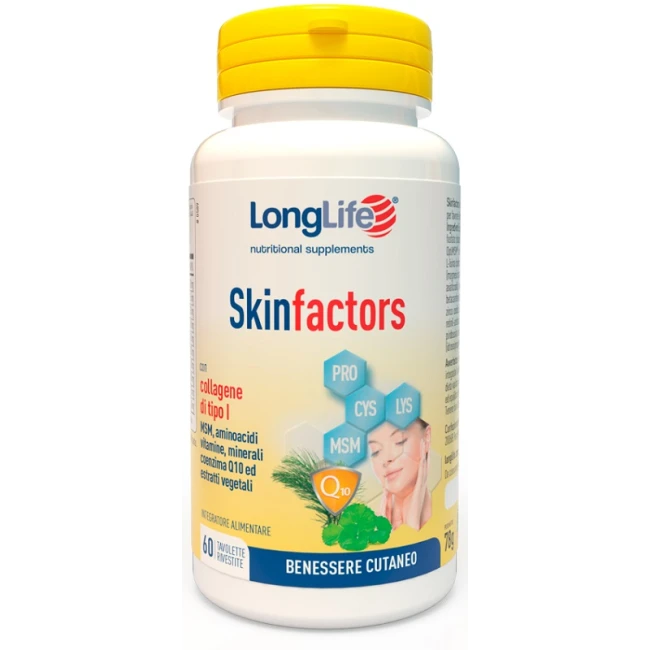 LongLife Skinfactors è un integratore formulato con vitamine, minerali, collagene, aminoacidi e nutrienti antiossidanti specificamente studiati per favorire il benessere della pelle, dei capelli e delle unghie.