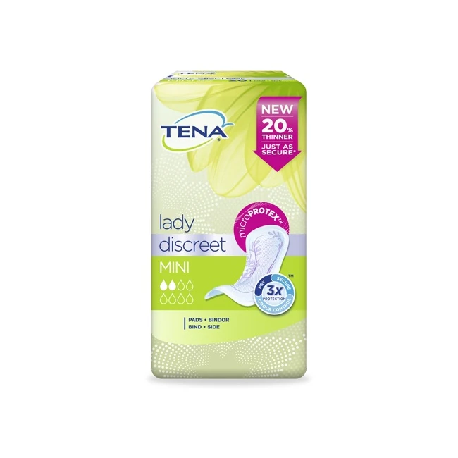 Ogni assorbente TENA Lady Discreet Mini è confezionato singolarmente con il sistema Easy Wrap e può essere comodamente tenuto in tasca o in borsa. Gli assorbenti TENA Lady Discreet Mini possono essere portati ovunque e smaltiti in modo discreto.