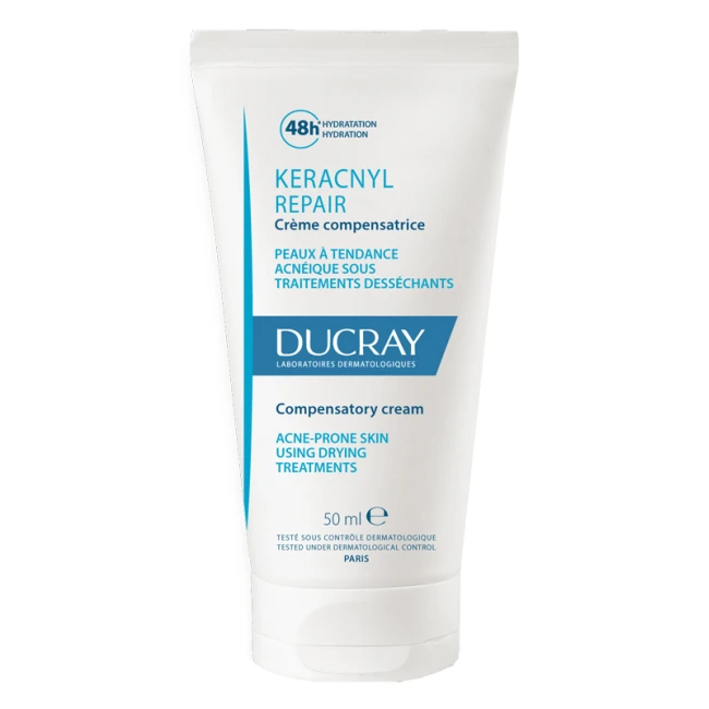 Ducray Keracnyl Repair è una crema per il viso formulata per compensare gli effetti indesiderati causati da trattamenti dermatologici disseccanti, come quelli antiacne la cui texture morbida e non grassa avvolge la pelle in un comfort immediato, riducendo la sensazione di tensione e secchezza.
