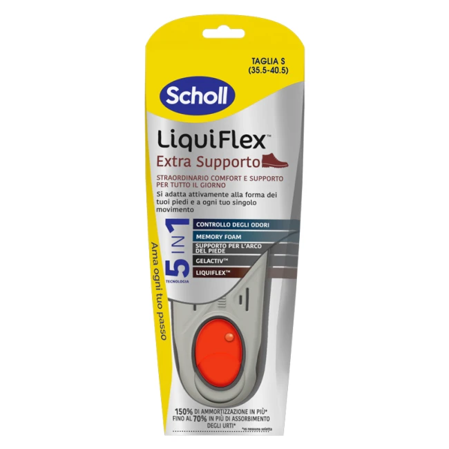 Inserire le solette Scholl LiquiFlex con la capsula LiquiFlex rivolta verso il basso. La soletta dovrebbe essere piatta. Può essere necessario tagliarla ulteriormente per adattarla al meglio alla scarpa.