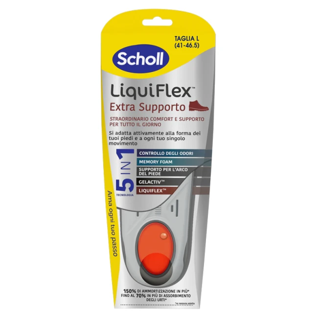 Inserire le solette Scholl LiquiFlex con la capsula LiquiFlex rivolta verso il basso. La soletta dovrebbe essere piatta. Può essere necessario tagliarla ulteriormente per adattarla al meglio alla scarpa.