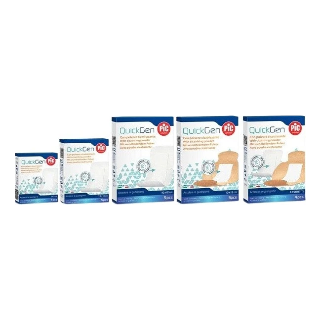 È un cerotto Pic con acido ialuronico che aiuta la cute a rigenerarsi velocemente e quindi a cicatrizzare prima. Protegge la ferita e ne accelera il processo di guarigione grazie all'acido ialuronico contenuto nel tampone. QuickGen è consigliato in caso di escoriazioni, abrasioni e scottature con essudato. L'azione dell'acido ialuronico crea un film protettivo stabile sopra alla ferita che rimane cosi, sempre protetta e ben idratata: queste tre caratteristiche permettono alla pelle di rigenerarsi prima, e alla ferita di guarire velocemente. Il supporto adesivo in tessuto-non tessuto permette alla pelle di respirare, inoltre il formato "a farfalla" per articolazioni consente a gomiti e ginocchia elevata mobilità - grazie al supporto elastico e ai bordi ergonomici. QuickGen è presente in 4 referenze con dimensioni e forme diverse (tra cui la pratica shape a farfalla per articolazioni), piu una versione mix con una referenza per tipo: così puoi prenderti cura di ogni ferita nel modo più adatto.