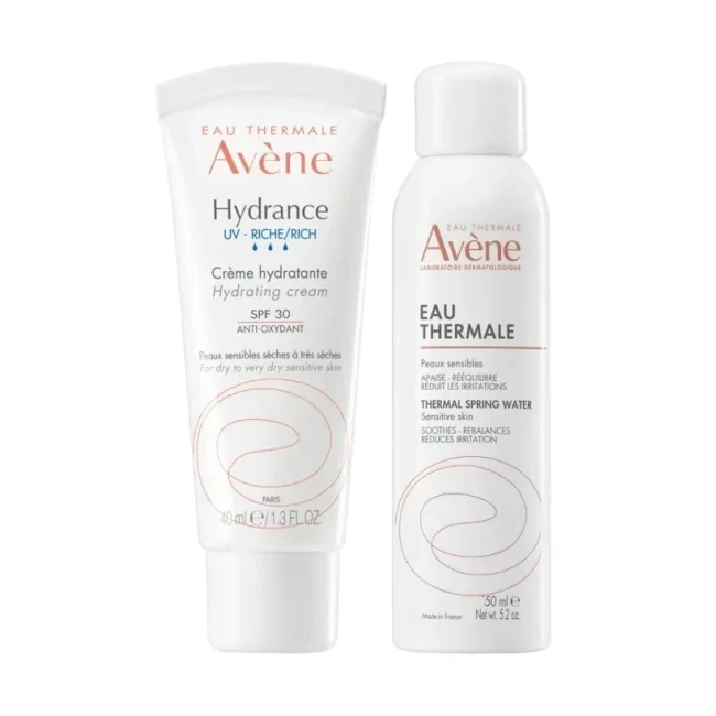 Combo di due prodotti: Hydrance UV Ricca SPF30 (40 ml) e Spray Acqua Termale Avène (50 ml). La crema idratante ha una texture ricca e vellutata che nutre intensamente e protegge dai raggi UV. Nello specifico, lo spray dona una sensazione immediata di freschezza e sollievo, ideale per pelli sensibili, arrossate o soggette a disagi cutanei.
