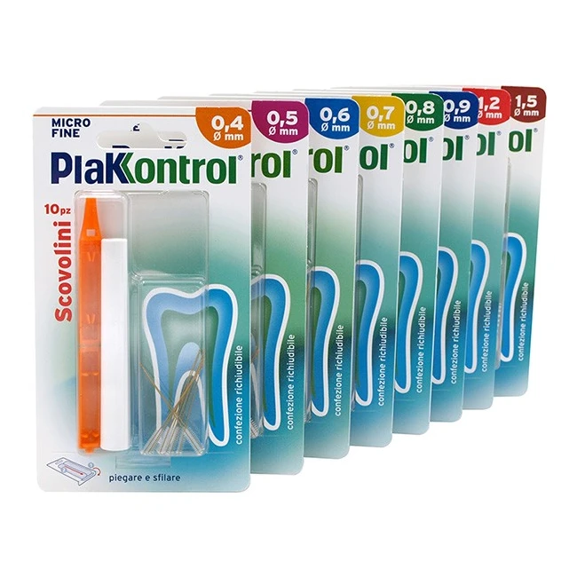 Scovolino a manico intercambiabile, con l'anima centrale in metallo rivestita in plastica per evitare fenomeni di sensibilizzazione galvanica (in presenza di impianti, apparecchi ortodontici, eccetera) e le setole in Nylon Du Pont, di diverso spessore e lunghezza per rimuovere meglio la placca, sono inserite con un innovativo processo antisfilacciamento.Disponibili in 7 misure: 0,4 mm, 0,5 mm, 0,6 mm, 0,7 mm, 0,8 mm, 0,9 mm, 1,2 mm.