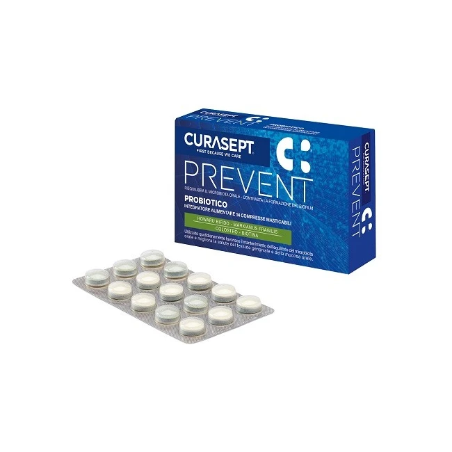Curasept Prevent Probiotico combina un esclusivo mix di batteri probiotici e nutrienti essenziali: - **Bifidobacterium lactis HN019:** favorisce l’esito della terapia parodontale e sostiene la salute orale. - **Kluyveromyces marxianus fragilis B0399:** contribuisce a contrastare l'alitosi. - **Colostro:** ricco di immunoglobuline e enzimi antibatterici, sostiene la protezione della mucosa. - **Biotina:** aiuta il buon funzionamento delle mucose, in particolare del tratto digerente.Adatto per