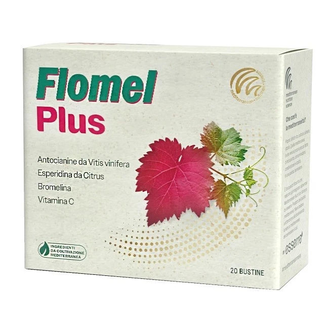 Flomel Plus contiene bromelina, estratto di vite rossa, esperidina e vitamina C. Non contiene glutine e lattosio, rendendolo adatto a diverse esigenze alimentari.Adatto per