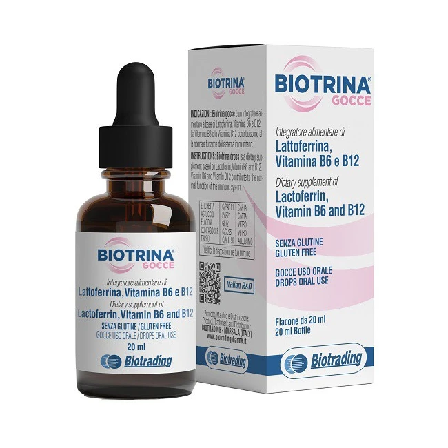 Biotrina Gocce è un integratore alimentare formulato per supportare il benessere generale grazie alla sua ricetta a base di lattoferrina e vitamine B6 e B12.A cosa serve