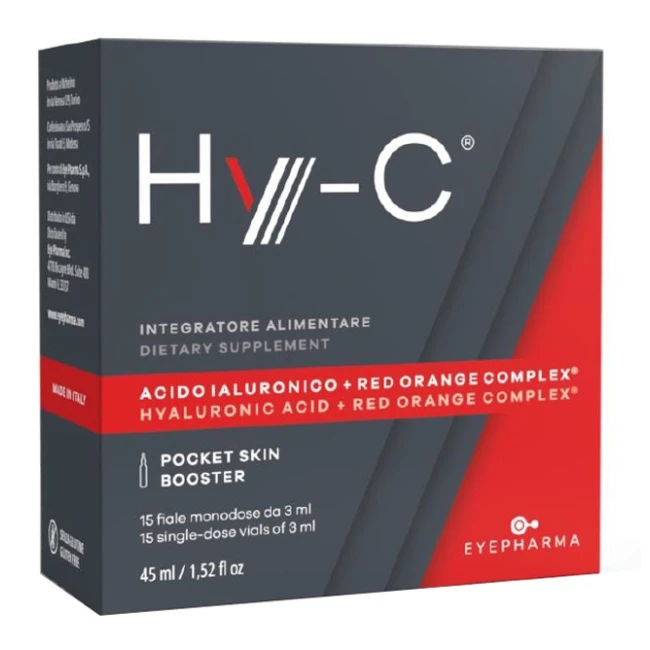 Eyepharma Hy-C si presenta in una pratica confezione da 15 fiale monodose da 3 ml, garantendo la massima comodità nell'assunzione quotidiana. Ogni fiala contiene un'elevata concentrazione di sodio ialuronato e RED ORANGE COMPLEX.Ingredienti