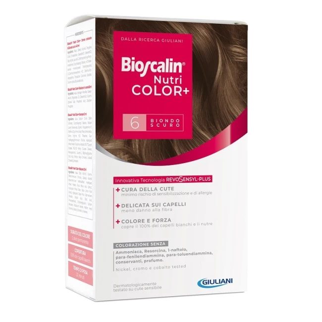 Dettagli Giuliani Bioscalin Nutricolor Plus 6 Biondo Scuro Crema Colorante 40 Ml + Rivelatore Crema 60 Ml + Shampoo 12 Ml + Trattamento F