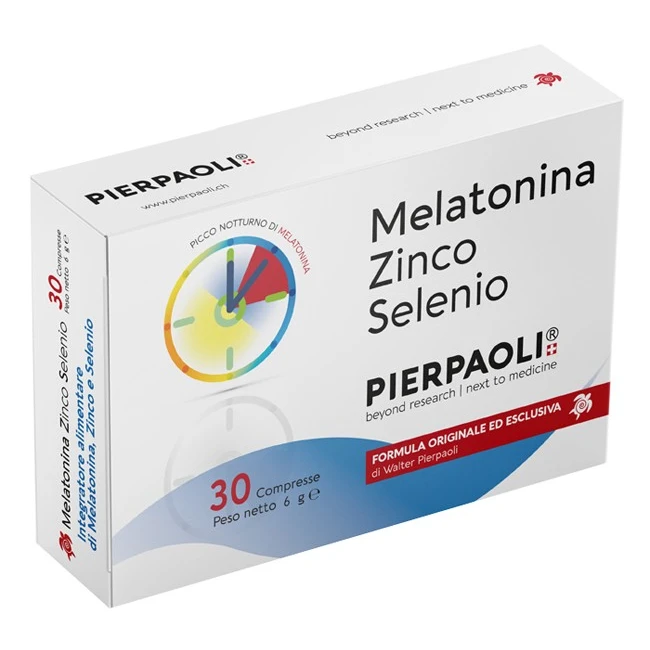 Melatonina Pierpaoli contribuisce alla riduzione del tempo richiesto per prendere sonno; l'effetto benefico si ottiene assumendo 1 mg di Melatonina poco prima di andare a dormire. La Melatonina contribuisce ad alleviare gli effetti del jet lag. Lo Zinco contribuisce alla normale funzione del sistema immunitario e alla protezione delle cellule dallo stress ossidativo. Il Selenio contribuisce alla protezione delle cellule dallo stress ossidativo e alla normale funzione tiroidea. Formula originale nata dalle osservazioni scientifiche maturate nel corso di cinquant'anni di ricerca e studi clinici condotti dal Prof. Walter Pierpaoli e dai suoi collaboratori, sulla Melatonina e sulla ghiandola Pineale, e sul loro stretto rapporto con i meccanismi dell'invecchiamento. La Melatonina Zinco Selenio Pierpaoli è stata sviluppata con l'intento di ottenere un picco di rilascio di Melatonina durante la notte ed è stata formulata per soddisfare il fabbisogno delle funzioni fisiologiche dell'organismo.