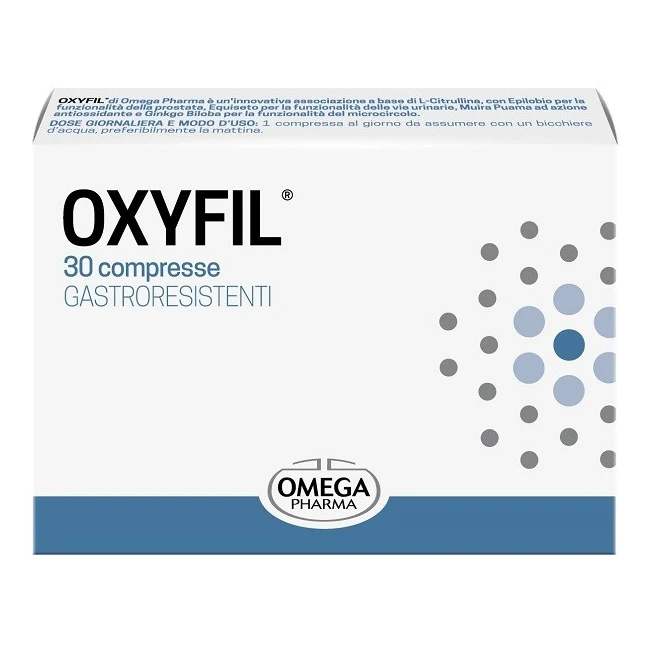 Omega Pharma Oxyfil è un integratore alimentare formulato con L-citrullina, arricchito con epilobio, equiseto, muira puama e Ginkgo biloba. Questo prodotto sostiene la funzionalità della prostata, favorisce il benessere delle vie urinarie e rinforza il microcircolo, grazie all'azione sinergica dei suoi ingredienti.A cosa serve