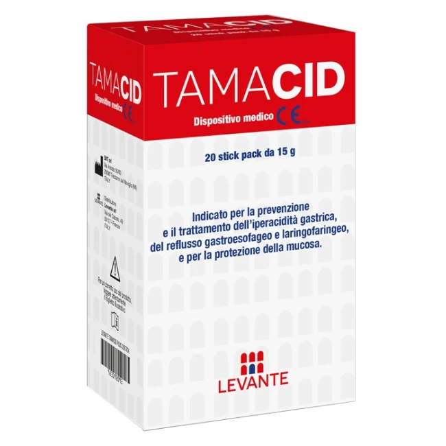 Levante Tamacid è un dispositivo medico concepito per la prevenzione e il trattamento dell'iperacidità gastrica. È efficace anche in caso di sintomi persistenti legati al reflusso gastroesofageo e laringofaringeo, contribuendo alla protezione della mucosa gastroesofagea.A cosa serve