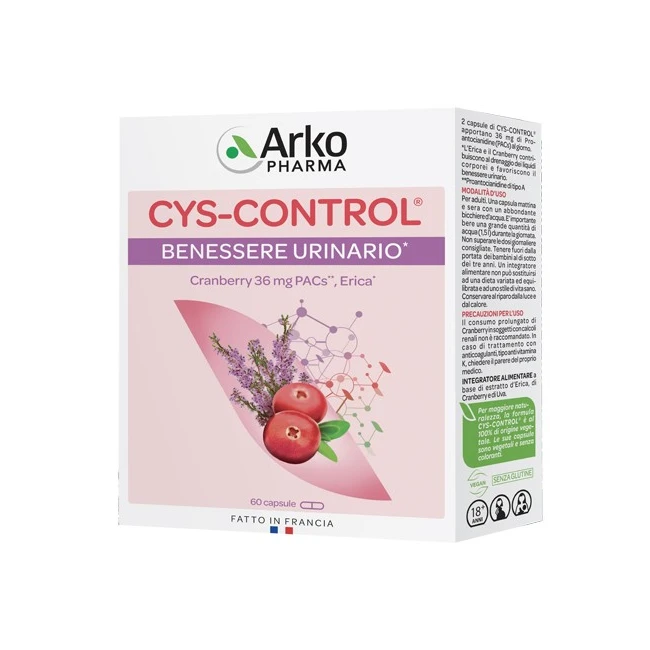 Cys-control di Arkopharma è formulato per contribuire al benessere del tratto urinario, grazie all'azione sinergica di erica e cranberry, entrambi noti per le loro proprietà benefiche.