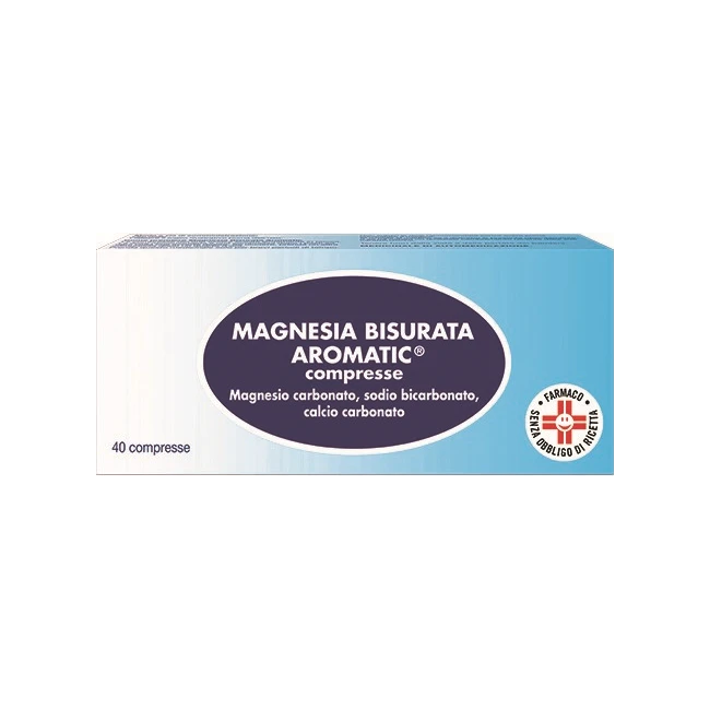 Magnesia Bisurata Aromatic è un medicinale antiacido di automedicazione a base di magnesio carbonato (71 mg), sodio bicarbonato (64,2 mg) e calcio carbonato (525 mg) per compressa che alcalini neutralizza rapidamente l’eccesso di acido presente nella parte alta del tratto gastro-esofageo, calmando in pochi minuti sintomi quali bruciore, pirosi retrosternale, acidità, rigurgiti acidi e dolori epigastrici passeggeri.