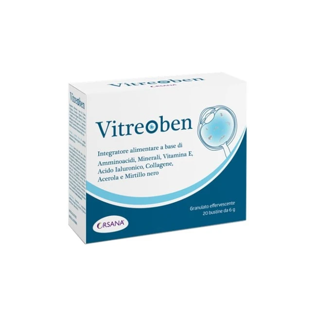 Orsana Vitreoben è un integratore alimentare sviluppato per supportare la salute del vitreo oculare, contribuendo a contrastare i fenomeni di formazione di addensamenti vitreali. È particolarmente indicato per persone che hanno subito interventi di chirurgia oftalmica, che presentano difetti refrattivi, o che sperimentano sintomi legati a scarsa idratazione e all'età.A cosa serve